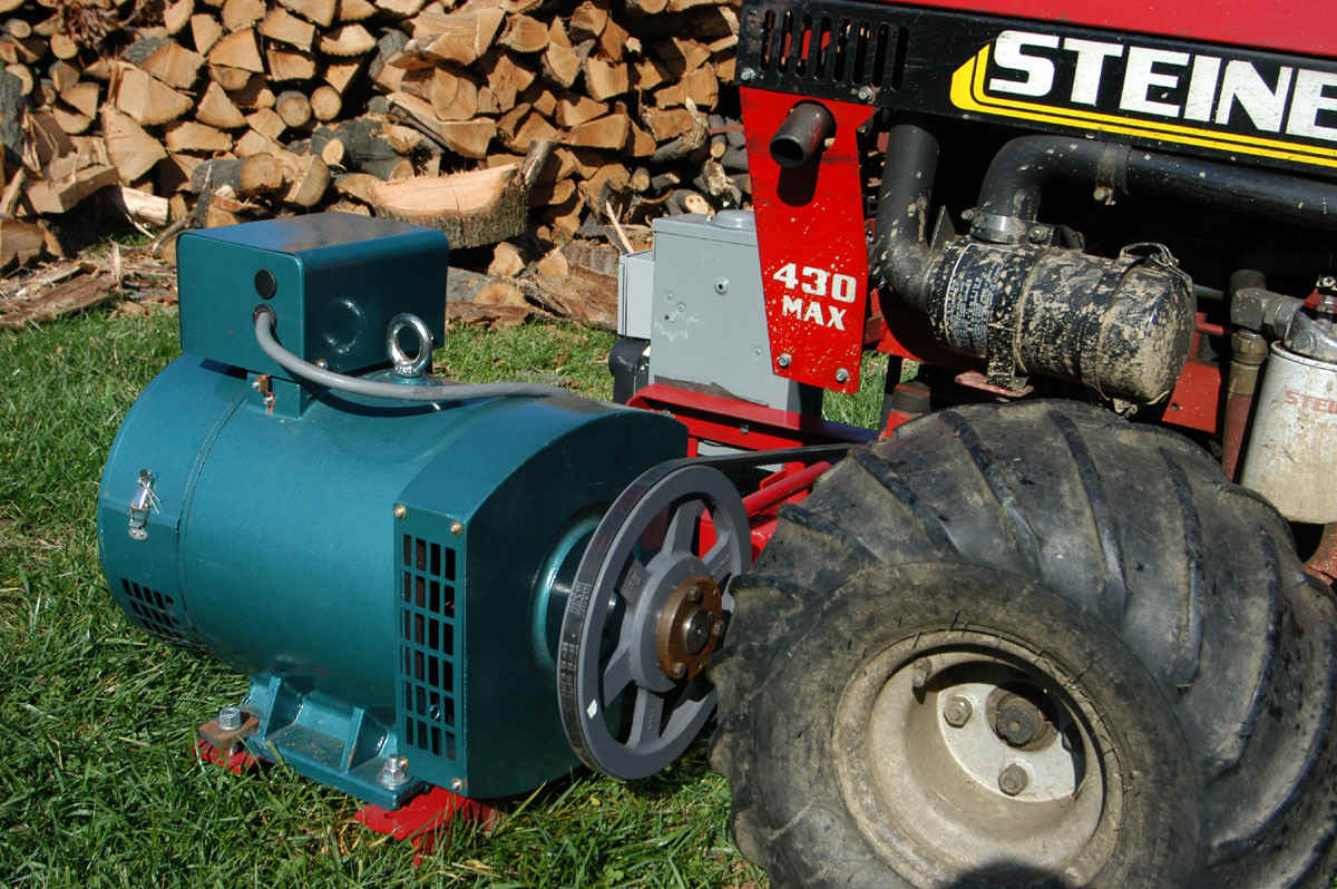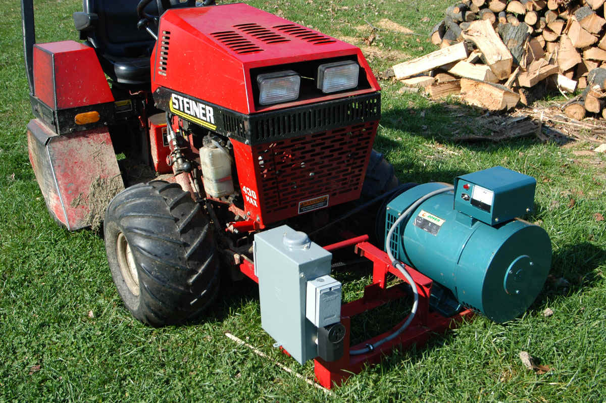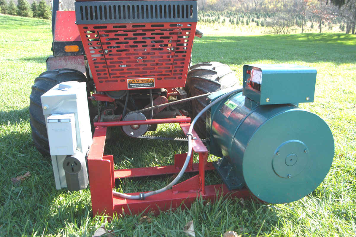 I am going to send you some photos on separate emails so I am sure that you receive them. My generator project is almost complete except for the voltage control that we discussed. The tractor that you will see in the photos is a 22 HP diesel. The power take off pulley in the front of the tractor runs approximately 4500 RPM. I had to use a rather large pulley on the generator to obtain 1800 RPM. I got the pulley from Grainger and the Grainger stock number is 2L292. The bushing for the pulley is a 1 5/8″ ID bushing and the stock number is 2L250. I had to have it machined out to accommodate the 42mm shaft on the generator. The bushing had a 3/8 keyway so I just machined 1/2 of the key to fit the keyway. The rest of the project is rather straight forward. The electrical box mounted on the frame is an outdoor box with breakers installed for both the 120 V and 220 Volt outlets. I put 2 120 outlets on one side of the winding and 2 outlets on the other side in order to divide the load. I will mostly use the 220 outlet because that matches my input to the house.